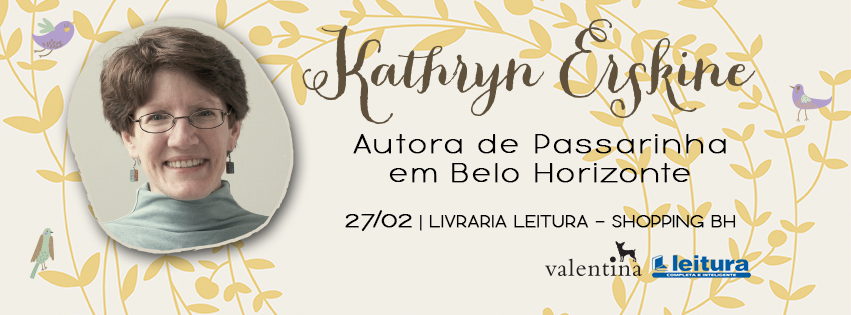 A Valentina nos convida para o encontro com a autora de Passarinha, Kathryn Erskine, que estará na Livraria Leitura do Shopping BH para conhecer e conversar com os leitores brasileiros, no dia 27 de Fevereiro. Veja mais detalhes e confirme sua presença no evento do Facebook, aqui.
